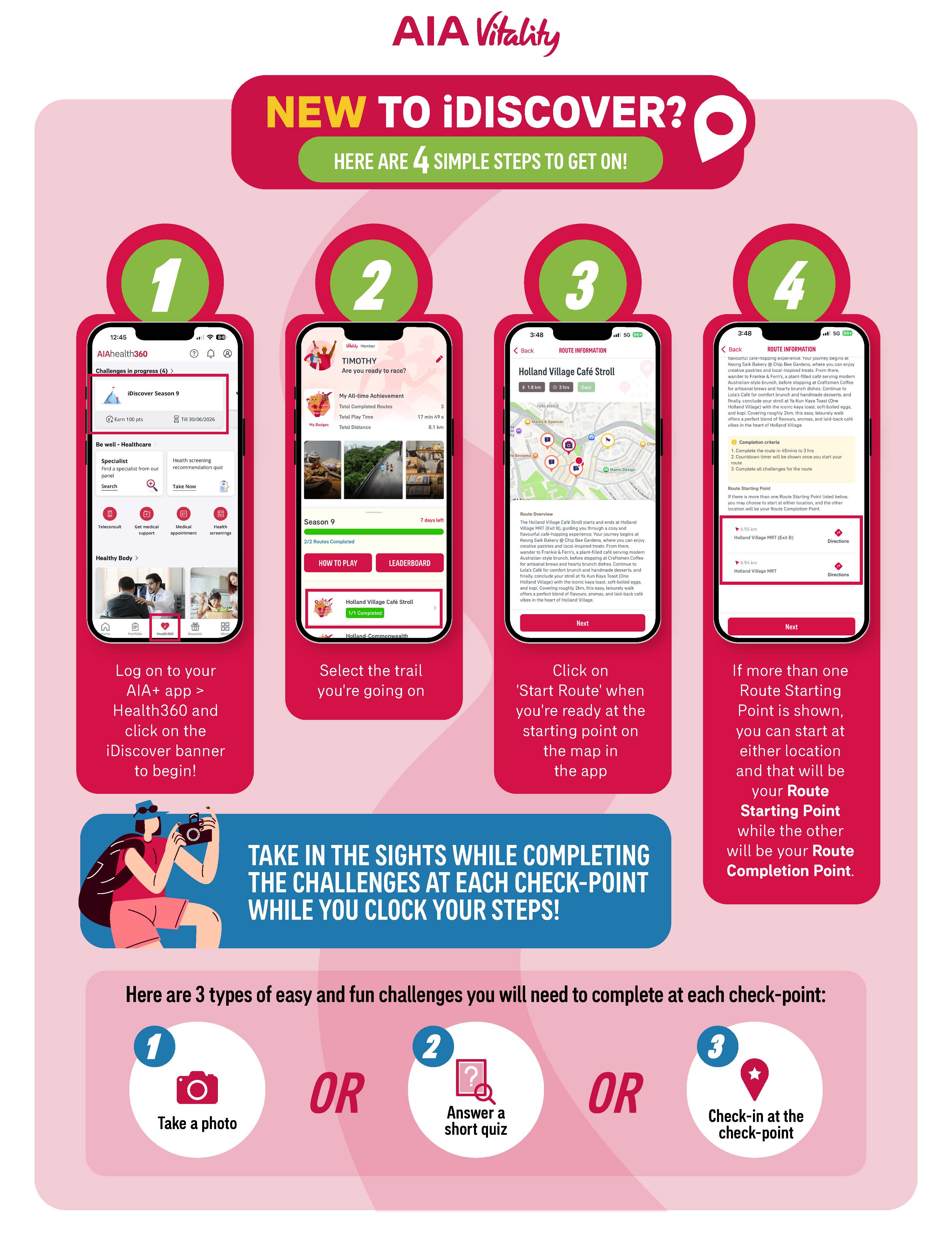iDiscover with AIA Vitality is a GPS-enabled feature in the AIA+ app for AIA Vitality members. Pick a trail, explore at your own pace and earn rewards as you go along.